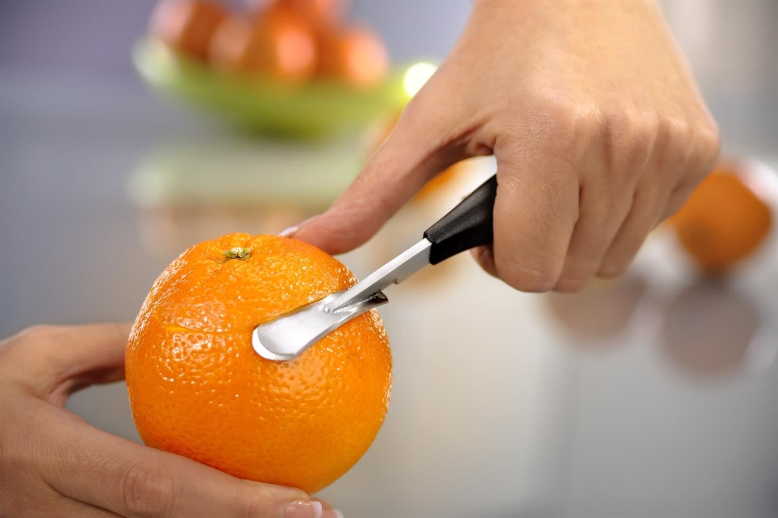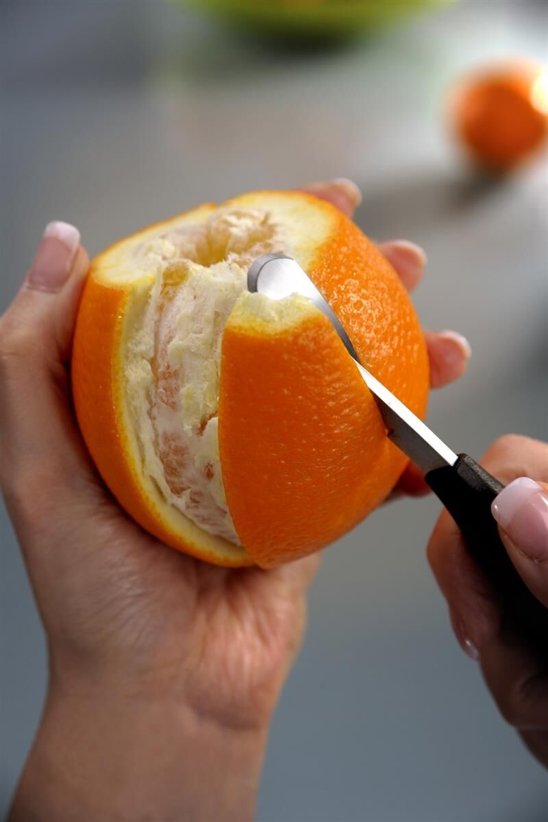 Schale entfernen leicht gemacht! Einfach die Schale von z. B. Orangen einritzen und mit dem Orangenschäler entfernen. Der ergonomische Griff liegt gut in der Hand.